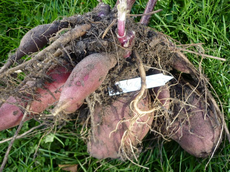 Nein, gedüngt wurde nicht. Der Boden ist eben schwerer Lehm. Die Knollen waren makellos, Drahtwürmer und Schnecken mögen sie wohl nicht. Die Süsskartoffeln in der Nähe waren durchaus wieder angefressen, am Nichtvorhandensein der Schädlinge lag es nicht. Eine ziemlich gesunde Pflanze abgesehen von der Wasserbedürftigkeit, Sturm, Blattläuse, allerlei Raupen, Sonnenbrand, nichts hat sie niedergemacht. Das dargebotene Grün wird übrigens auch von den Hühnern abgelehnt. Unsere sind ansonsten wenig heikel und fressen viel.