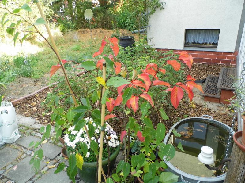 Ich will ihn nicht in die Mitte dieses Winkels setzen sondern etwa in die Flucht vom Haus und da in die Mitte zwischen Regentonne und vorn. Das soll kein so ganz kleiner Baum bleiben, aber genau weiß das niemand. Diese Sorte scheint sehr speziell zu sein.