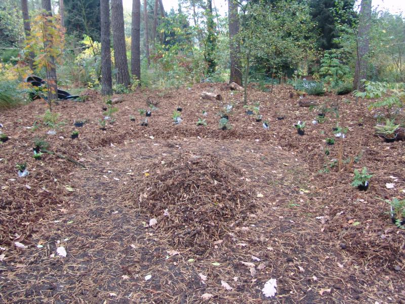 Danach lag ich einige Wochen auf den Knien und entgrünte, d.h. buddelte das Gebiet 20-30 cm um, um möglichst viel Quecke und anderes unerwünschtes Zeug zu entfernen. Danach wurden die Schredderhaufen verteilt, die zu versenkenden Pflanzen (vorrangig Farne und Efeu (selbiges ist noch nicht verteilt) erstmal probeweise zum Überlegen ausgelegt. Es sollte noch eine Wegführung erfolgen. Am Wochenende werde ich darüber brüten. Danach sind noch ca. 3.000 Blumenzwiebeln (vorrangig bot. Narzissen und Tulpen sowie Iris reticulata) zu verteilen. Ich weiß, ich bin bekloppt.