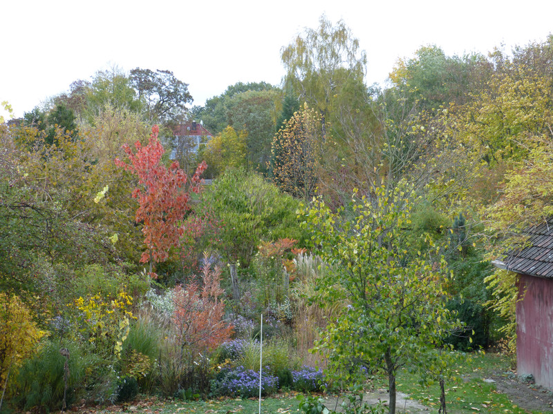 Und im Gegensatz dazu von heute. Im Moment verändert sich der Garten täglich. Die Felsenbirne ist kahl, die Lindera nur noch fahlbraun, dafür leuchtet nun Acer x freemanii 'Jeffers Red'.