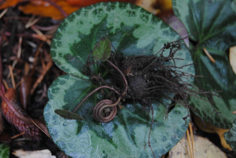 Ein ganz wenig bei Cyclamen coum ´Large dark nose´ schon im zweiten Jahr