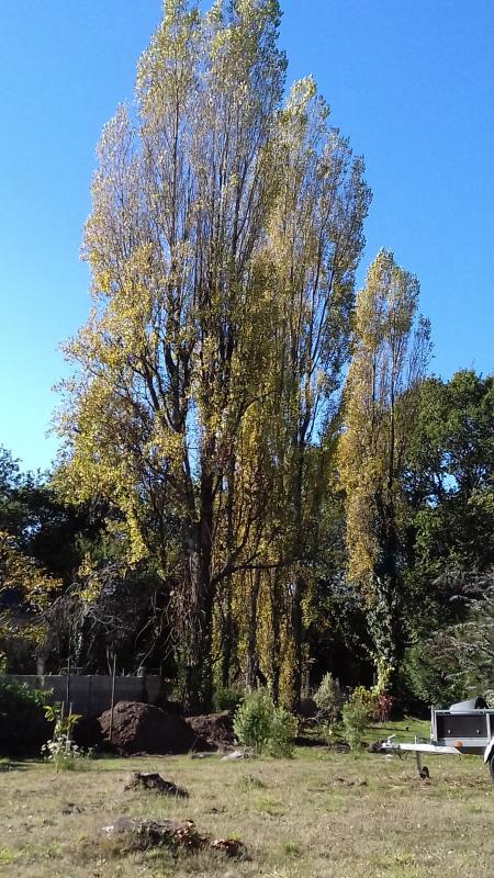 Es würde mich wundern, wenn die Vorbesitzer ausgerechnet beim ersten Baum eine andere Sorte gewählt hätten. Die Krone ist ebenfalls Säulenpappel typisch, halt sehr hoch (nicht mehr vom Photo erfasst).