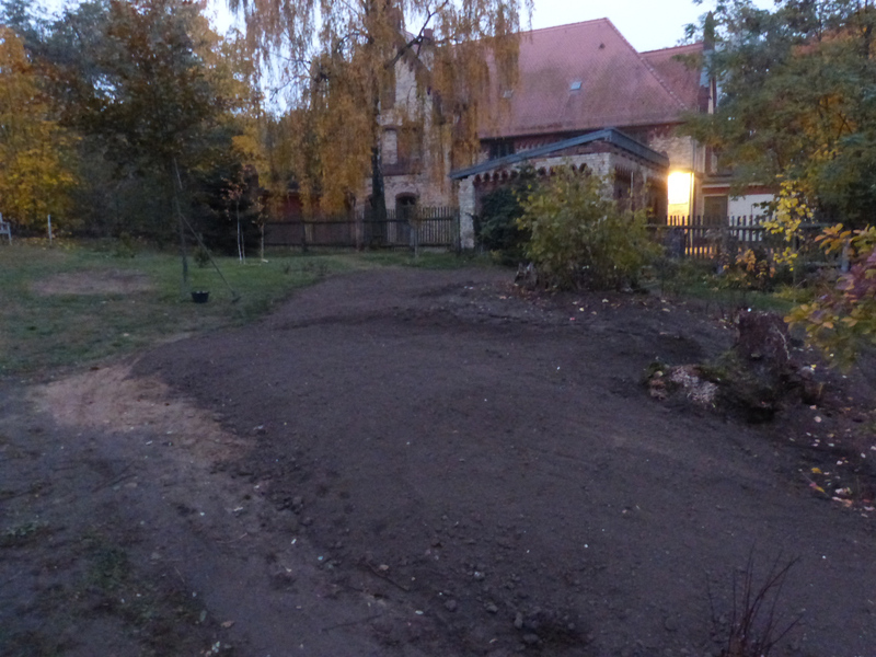 Nicht ganz... es sind immer noch gut 2 Kubikmeter übrig. Der Haufen ist größer, als gedacht. Am Birkenhain nimmt das Ganze aber Form an. Für's Foto war's dann schon etwas zu dunkel.
