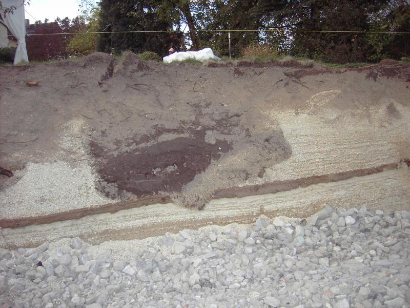 Da das Baugebiet öffentlich zugänglich war/ist, habe ich mir mal das aktuelle Bodenprofil angeschaut. So dürfte es hier, jedenfalls dort, wo noch nicht ausgebimst wurde, unter vielen Gartengrundstücken aussehen.