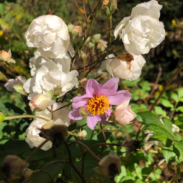 Saponaria intermedia hort. blüht unverdrossen. Die Anemone zählt nicht richtig, weil sie neu gepflanzt ist. Nicht alle Herbstastern sind schon durch. Aster ageratoides 'Ezo Murasaki' hält noch durch.