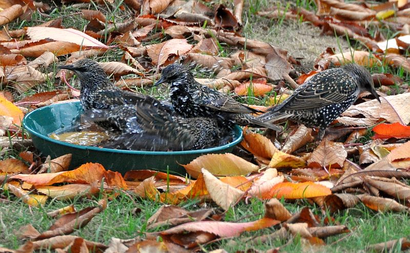 Wir hatten heute auch Starenshow. Sie haben überall auf der Wiese das herumliegende Laub umgewendet und dann hat einer die Vogeltränke - ein wassergefüllter Blumenuntersetzer - entdeckt. Jetzt weiß ich, daß in diesem Untersetzer bis zu 4 Stare gleichzeitig baden können :D.