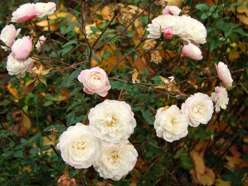 Immer noch ansehnlich ist 'Little White Pet'eine rundlich wachsende Chinarose,die seit Jahren dicht am Stamm von einer Zierkirsche wächst und äußerst robust und genügsam ist.