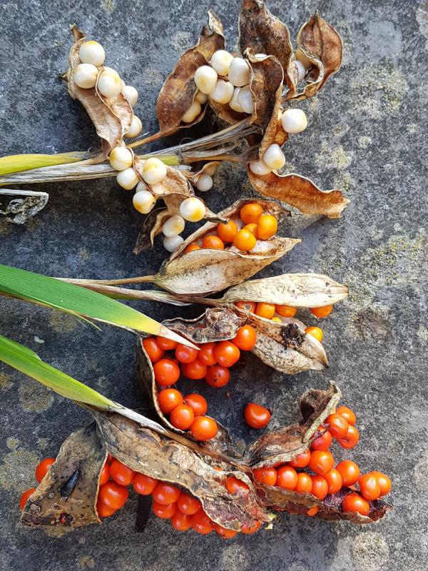 ein Besuch einiger Purler bei uns im Garten hat mich motiviert, hier endlich mal wieder etwas zu schreiben und nicht nur zu lesen.... und diese I. foetidissima interessieren mich seit vielen Jahren schon sehr. Der lästige Schädling tauchte ca. 2015 hier auf und lässt sich nicht gut bekämpfen. Ich schneide jetzt das Laub im Spätwinter komplett zurück, was natürlich sehr schade ist. Blüten und Früchte gibt es trotzdem reichlich, scheint also nicht zu sehr zu schwächen. Anbei ein Foto der drei Farbschläge die hier wachsen. Kann wohl jemand eine ganz gelbfruchtige mal als Bild zeigen? Ich habe bisher auch nur einen nicht blühenden aber sehr gut wachsenden Fächer aus der so oft genannten tollen Quelle!
