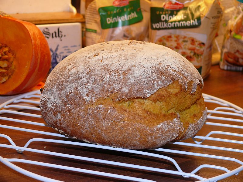 Heute wurde es ein Kürbis-Dinkelbrot. Es ist etwas höher geworden als die anderen