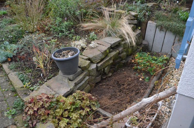 Bislang wuchsen dort ein großer Buchs (an der Seite) und 2 Sorten Geranium. Der Buchs wurde gerodet, ein Teil des Geraniums auch (langweilig, kaum Blüten).