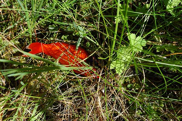 nochmal ein Ausschnitt zur genaueren Betrachtung: Goldfischauge unten links, Ringelnatterauge etwas darüber, beide an Land direkt vor meinem Fuß ( ist ein Suchbild, ich weiß, trotzdem - anders wars nicht zu packen, es ging blitzschnell - eine Chance für Wiederholung gab es nicht, weil ich natürlich ....hhhmmmm.... den Goldfisch gerettet habe.... )