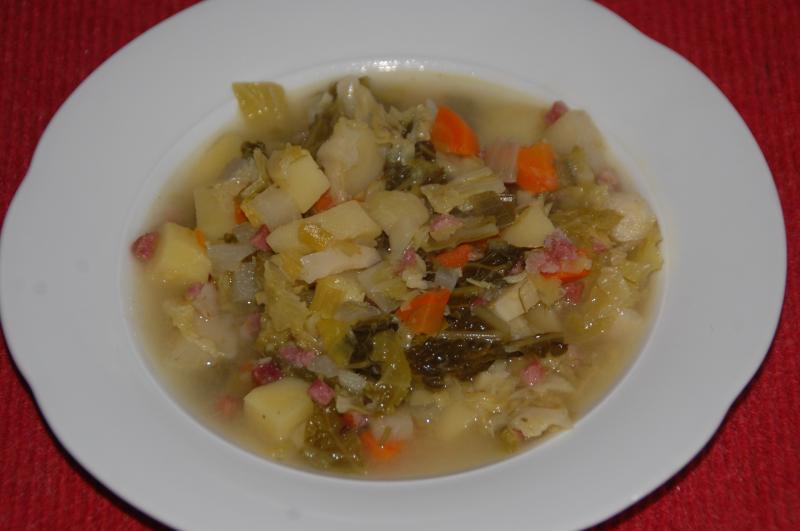 Wirsingkohlsuppe (Wirsing, Porree, Möhre, Zwiebel, Kartoffel, Kohlrabi, Petersilienwurzel, Schinkenwürfel, Kümmel, Salz, Butter, eingesalznes Selleriegrün)