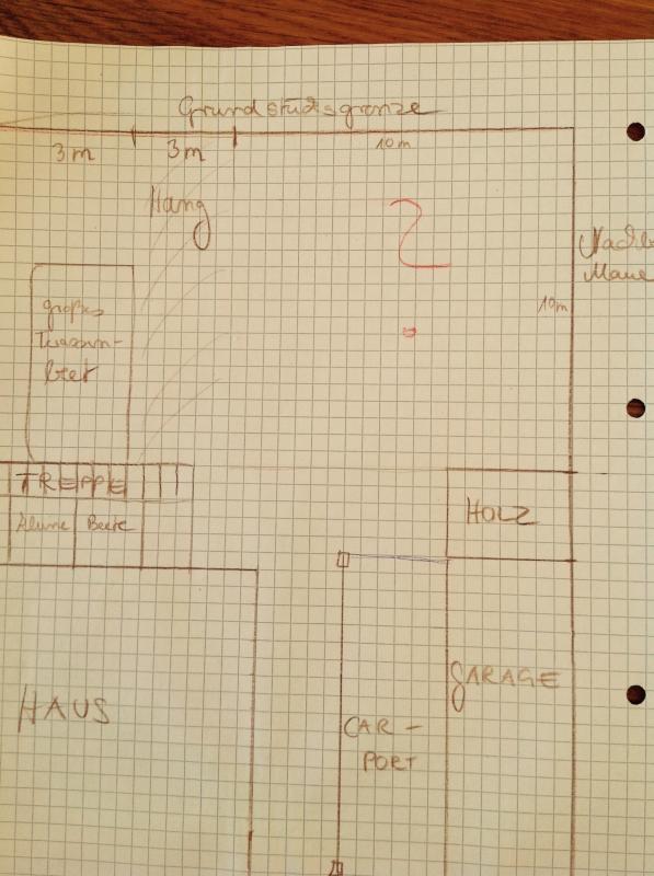 Außerdem möchte ich hinten zur Mauer hin ein bisschen nutzbeet haben, heißt da sollen Tomaten, Himbeeren und Brombeeren ihren Platz finden. Davor muss also auch ein kleiner Weg hin. Ich skizziere mal meine Überlegungen