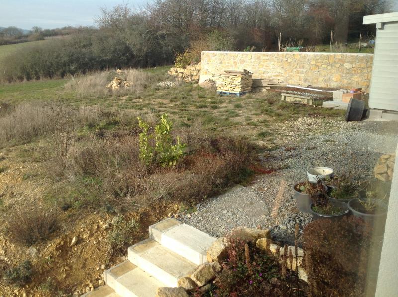 Aktuell ist hier noch Land unter, wir haben vor, im Frühjahr das Gelände anzugleichen, geplant ist eine zweite Ebene für ein weiteres Terrassenbeet gleicher Fläche, also 6,80 auf 3 m, und dann.... Tja. Mir schwebt über dem Beet dann ein Sitzplatz vor, der es zulässt, Richtung Süden den gesamten unteren Gartenteil zu überschauen. Abgrenzen möchte ich ihn mit Naturstein, welchen wir noch haben, konform zur Terrasse. Er soll vier Leuten Platz bieten, ich überlege, ihn durch eine kleine Natursteinmauer im Rücken zu begrenzen, Träume auch von einer kleinen Stellfläche für einen feuerkorb davor. Vielleicht zeige ich erst mal Bilder des areals . Als erstes den Hang, wie er grad noch ist.