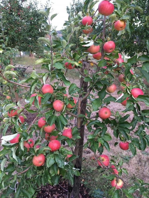 Paradis Elegance. Den Baum habe ich als einjährige Veredlung gekauft. Bereits im Jahr nach der Pflanzung (2018) hat der Baum reichlich Äpfel getragen. Wer schöne rote Äpfel sucht wird kaum etwas schöneres finden. Das kleine Bäumchen sah aus, als ob jemand rote Christbaumkugel drangehängt hätte. Ein Apfel wie der andere und jeder Apfel wie gemalt. Der Baum wuchs sehr schön verzweigt. Leider ist der Geschmack eher Mainstream. Gut, aber etwas gewöhnlich. Allerdings allemal so gut wie die Äpfel aus dem Supermarkt.