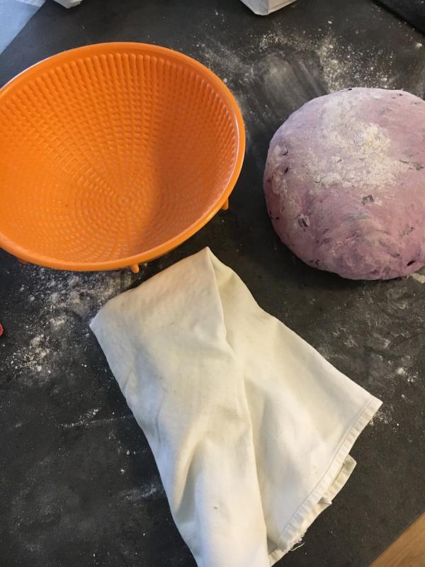 Nun ein Leinentuch oder Geschirrtuch in eine Schüssel legen, kräftig mit Roggenmehl bemehlen (wer ein schönes Gärkörbchen hat kann es auch ohne Tuch machen) und das Brot reingelegt. Entweder mit Schluss nach unten, dann reißt die Brotoberfläche im Ofen nachher rustikal auf oder mit Schluss nach oben, dann kann man das Brot nach eigenen Wünschen einschneiden.