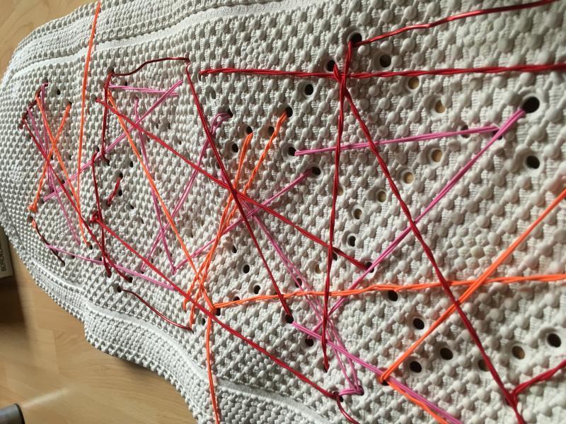 Jetzt ist noch Experimentierphase. Involviert sind Elastikschnüre, ein roter Aludraht (ich trau der Stabilität von altem Plastik nicht), Kartonschächtelchen und rosa Pfeifenputzer. Mal sehen... erstmal gibts die Matrix: Die Elastikschnüre spann ich kreuz&quer drüber und klemm dann die Kartönchen drunter.