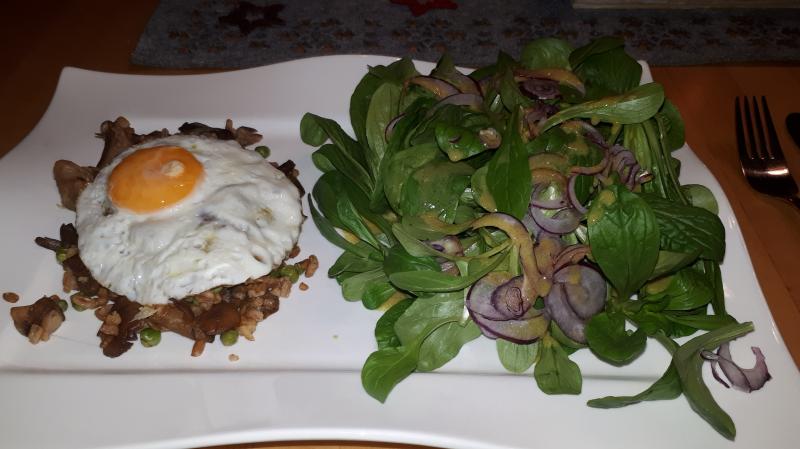 Dinkel mit Pilzen und Erbsen gebraten, Spiegelei und Garten- Feldsalat