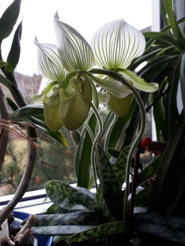 Und hier steht Paphiopedilum maudiae seit zwei Tagen in voller Blüte. Das heißt, drei Blüten sind geöffnet und ein kleinerer Nachzügler braucht noch einige Tage.