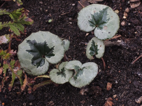 Die hintere silberne ist eine der drei ersten, die ich 2012 gepflanzt hatte und bei mir den Anfang der Cyclamen-Begeisterung markieren, könnte sein, dass ich die unter 'Silver Cloud White' gekauft habe: