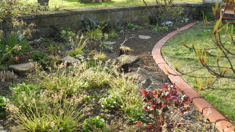 Ich verschätze mich auch immer mit den Randsteinen, weil ich nicht nachmesse, aber da ich ohnehin immer wieder welche brauche, nehme ich bei jeder Fahrt in die Stadt halt einfach zwei, drei Dutzend mit, das geht vom Gewicht her gerade noch so. ;) Auf jeden Fall ist das sehr schön geworden! Würden am Beetrand Heuchera passen? Die ist ja meistens wintergrün und vertragen problemlos auch Sonne, im Lehm sogar ohne sie großartig zu wässern.