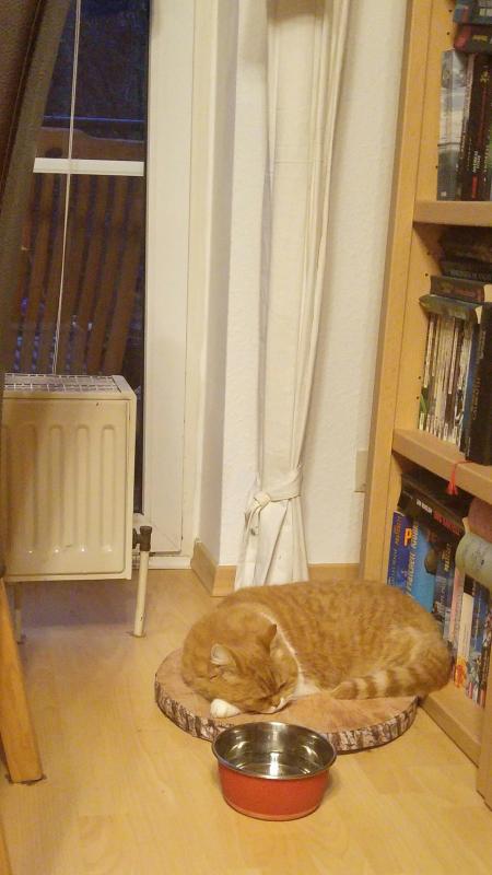 Er probierte schon kuschelnd mit uns das Sofa und nun das kleine Kissen nah der Heizung aus. Sobald der Nachbar Lärm macht oder wir die Klospülung betätigen, geht es hinter die etwas umgestellte ( kein Block nah der Wand mehr, sondern mehrteilig auseinander gezogen, so dass ich Miez zur Not hochnehmen könnte) Bücherwand, aber in Kürze ist man wieder da :D.