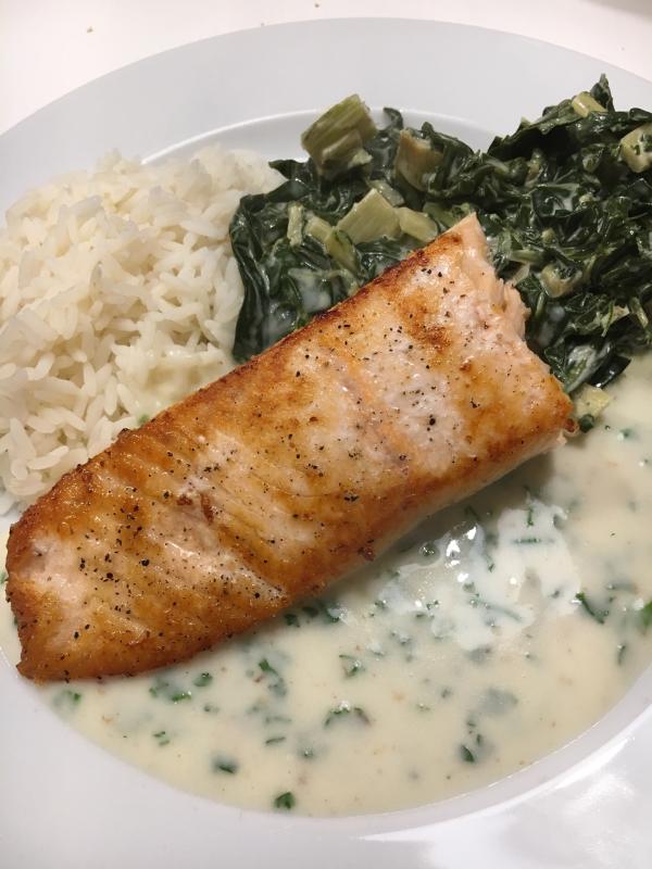 Lachs, Reis, Petersiliensoße und Mangold frisch aus dem Garten