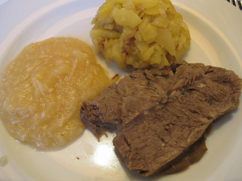 Rindsuppe mit Parmesanrucolagriesnockerl, gekochtes Schulterscherzl mit Erdäpfelschmarrn und Apfelkren