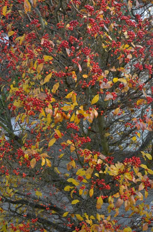 Hier leuchtet noch immer der Apfeldorn, auch wenn der kräftige Wind der letzten Tage viel Laub verweht hat.