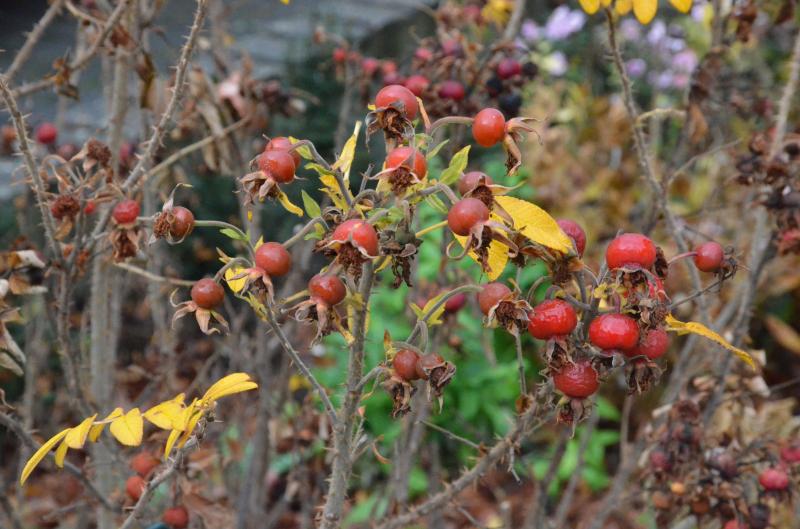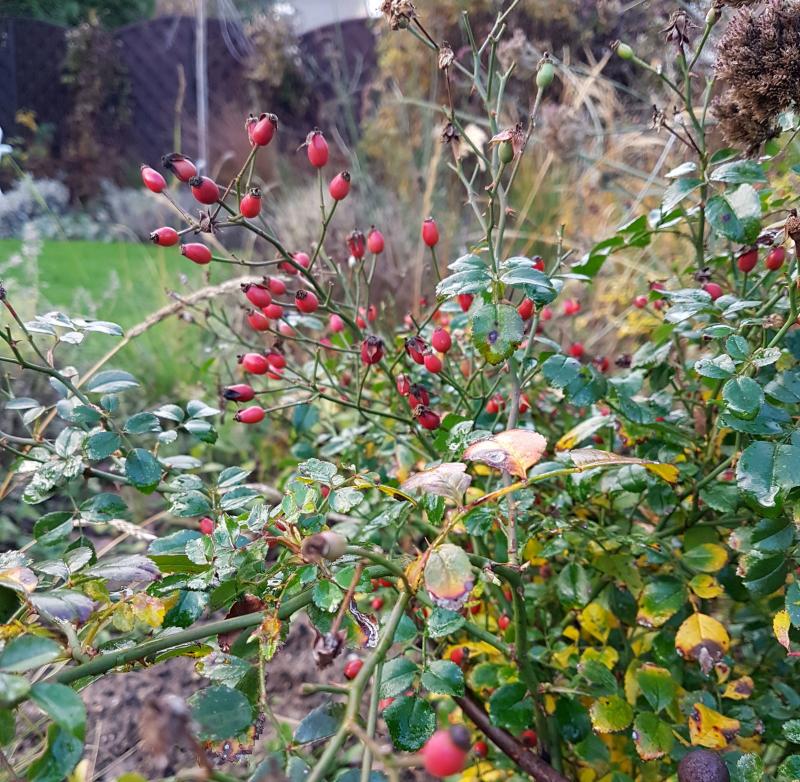 Rose Sternenflor mit schönen kleinen Hagebutten bringt noch etwas Farbe in den trüben Tag.