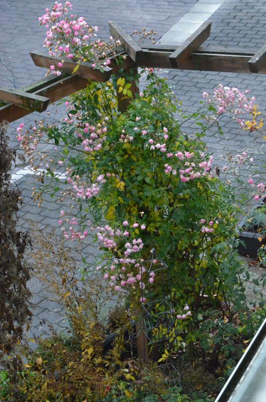 Auch die Rose 'Moje Hammarberg' gebärdet sich herbstlich.