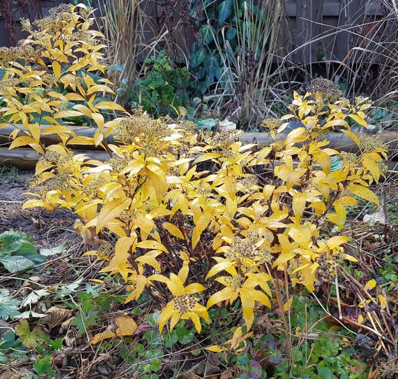 spirea japonica albiflora schmückt sich noch im schönen Gelb.