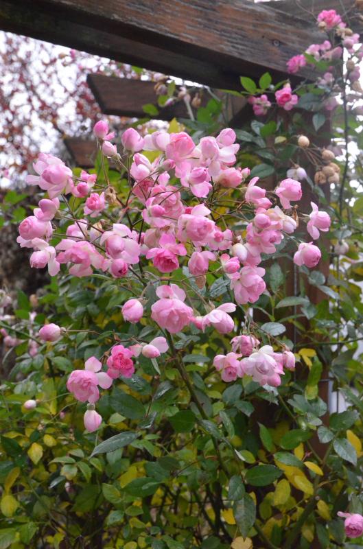 Auch die Rose 'Moje Hammarberg' gebärdet sich herbstlich.