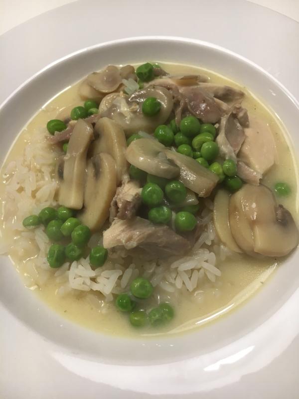 Wir hatten Hühnerfrikassee mit Reis und Hochbeetkopfsalat