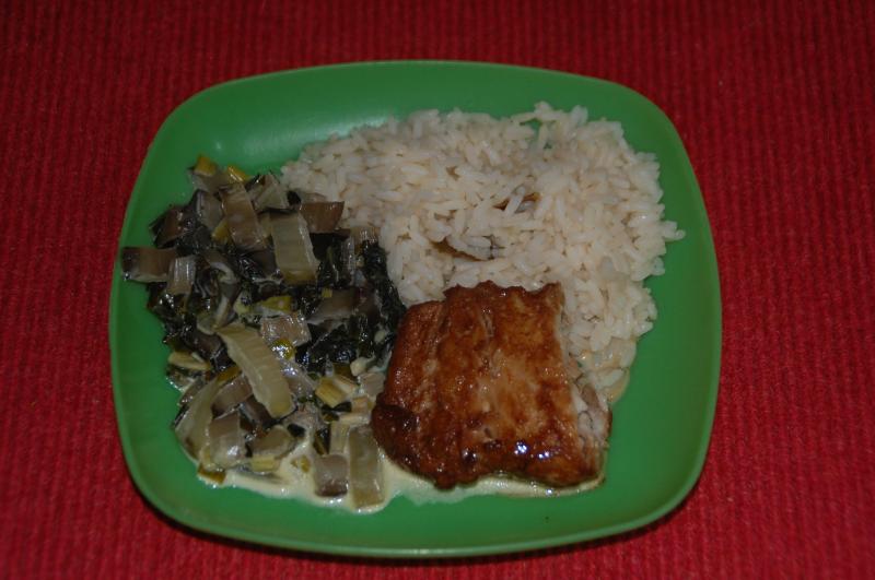 Kaffirlimettenreis mit Sahnemangold und Köhler, abgelöscht mit Sojasauce