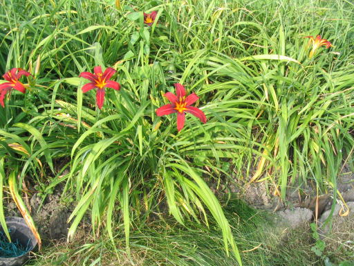 die erste Rote von der Hemerocalliswiese:Bluetendurchmesser 13 cm13 Blueten am Stiel!Bluetenstiel 62 cm hochkein DuftPflanze 48cm hoch, schmale Blaetter