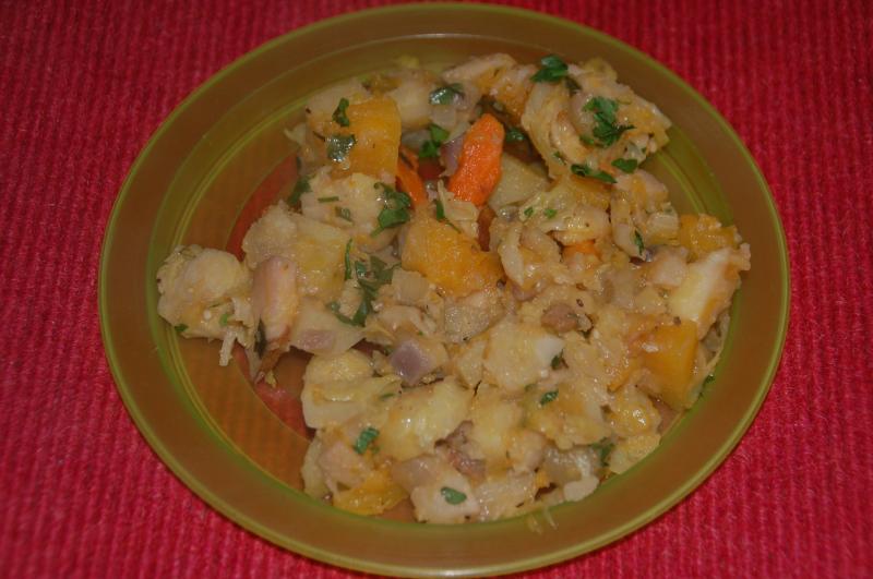 Gemüsepfanne aus Hühnerfett, roter Zwiebel, Möhre, Knobi, Pastinake, Petersilienwurzel, Rosenkohl, Kürbis, Fenchel, Quitte, Kartoffel, Yacon, Salbei und Petersilie