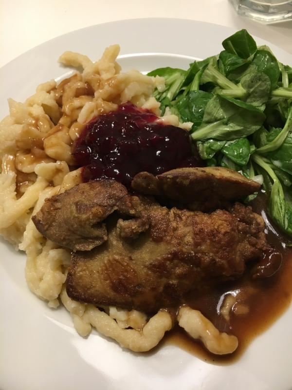 Mehlierte Flugentenleber mit Spätzle, Preiselbeeren und Ackersalat