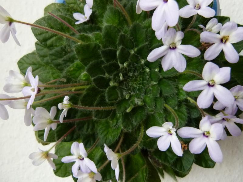 Petrocosmea forrestii als lebendes "Bild" an der Wand.