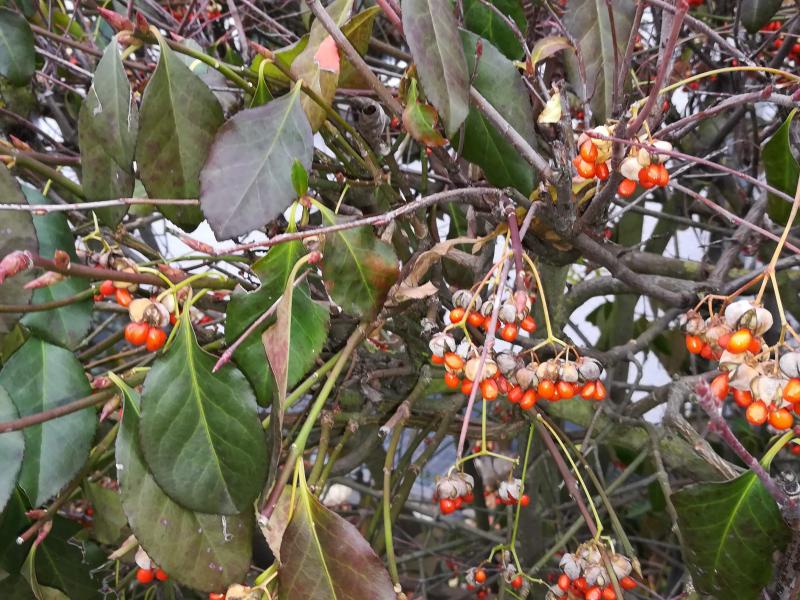 Der Euonymus ist aber auch schon durch, die Rotkelchen haben sich die Früchte längst geholt.