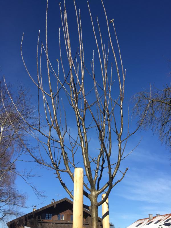 Achso, der Baum wurde auch erst am Samstag bei Schnee gepflanzt. Keine Ahnung, ob er wegen des Frosts den Schnitt dann nicht gemacht hat.