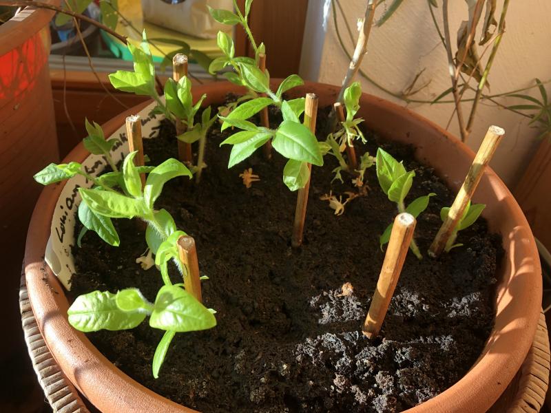 Ich hatte die Stecklinge die ganze Zeit draußen, nur bei starkem Frost habe ich sie nach drinnen geholt, und vor ein, zwei Wochen öffneten sich ein paar Blüten, die ich aber auf Anubias' Empfehlung hin entfernt habe. Jetzt zeigt sich das erste Grün, mal sehen, wie viele anwachsen. Fürs Auspflanzen ist es vielleicht noch etwas früh, im Moment habe ich auch noch keinen Platz, aber das wird bestimmt was. :D