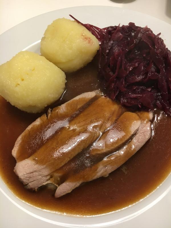 Heute Mittag waren wir eingeladen, es gab Reh, Rotkraut mit Maroni und Knödel.