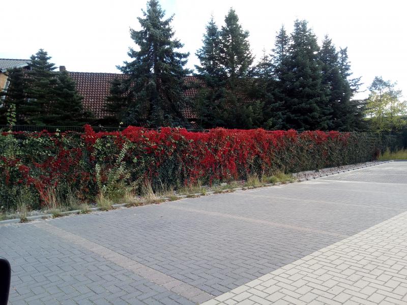 Ich hänge noch ne begrünte Alternative als Foto dran. Das Foto stammt von Anfang Dezember und der Nachbar uns gegenüber sah sich vor zwei Jahren mit dem Neubau unsers neuen örtlichen Parkplatzes konfrontiert. Unterbau Doppelstabmatten, Bepflanzung Efeu und Wein. Man guckt auf die brutzelheiße Westseite.