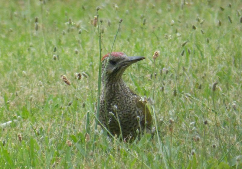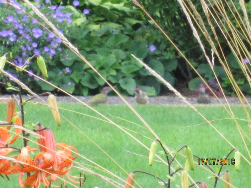 Das vermute ich auch, hier sind die Grünspechte fast täglich im Garten zu beobachten und man hört ihre lachenden Rufe. Das Flugbild ist auch charakteristisch, irgendwie wie Torpedos. Im Sommer habe ich ein Elterntier mit zwei Jungen (verschwommen) fotografiert, ein dritter Jungvogel und der andere Altvogel sind nicht im Bild.