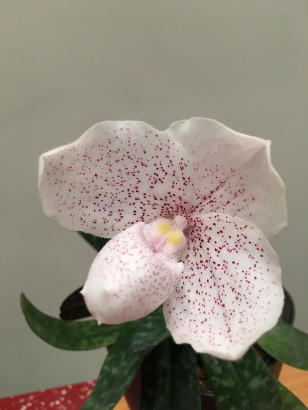 Und hier steht Paphiopedilum maudiae seit zwei Tagen in voller Blüte. Das heißt, drei Blüten sind geöffnet und ein kleinerer Nachzügler braucht noch einige Tage.