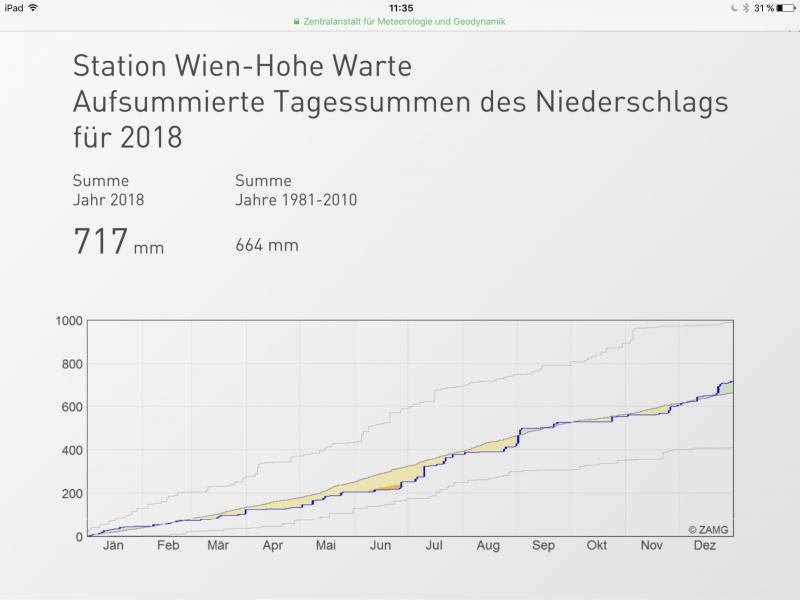 Wien (Hohe Warte) kommt auf 717 mm. 664 mm wären der Durchschnitt der Jahre 1981 - 2010. Hier auch eine sehr ungleiche Verteilung, in der Grafik der ZAMG sieht man die vielen Starkregenereignisse.