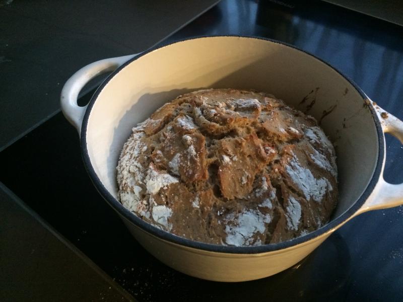 Den Teig mit bemehlten Händen in den Topf geben und mit Deckel in den Ofen geben. Nach 30 Minuten den Topf rausholen und den Deckel abnehmen. Wieder zurück in den Ofen und die Temperatur auf 200°C runterstellen. Nun (5-15 Minuten) weiterbacken bis die gewünschte Bräune erreicht ist. Bei mir waren es 10 Minuten.