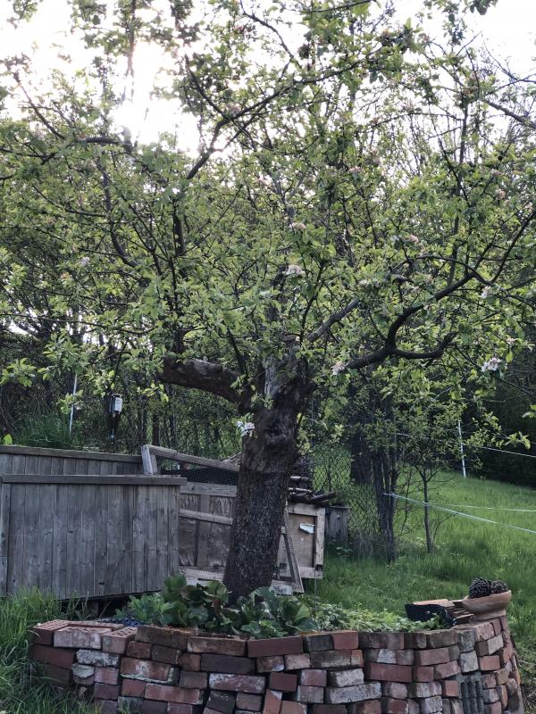 Ich wollte Euch mal das Ergebnis des Rückschnitts + Entfernung des Holunders zeigen. Der Rückschnitt war sehr stark, da starker Krebs-Befall. Ich hatte leise Zweifel, ob der Baum das überlebt. Hat er. 😃 Die Goldparmäne hat bereits voriges Jahr wieder gefruchtet und dieses Jahr voll in Blüte gestanden. 😃 Bis zum Frost… Na, schauen wir mal, was den Frost überstehen konnte.
