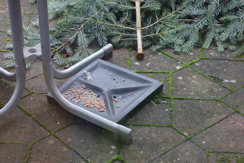 Aktuell biete ich eine halbe Kokosnuss mit Fettfutter an, dazu Meisenringe, einen Apfel, geknackte Walnüsse und loses Futter auf einem großen Untersatz eines Blumenkübels. Den kann ich gut reinigen. Darüber legte ich 2 Äste als Landestange für die Vögel. Eine Lösung für eine Überdachung dafür habe ich noch nicht.